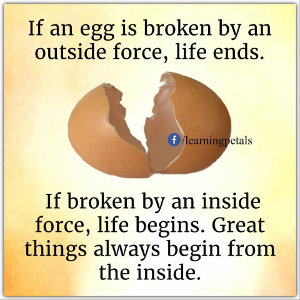 b) what kind of force is enabling development of that chicken and his life? Temperature, air... the outside force... The outside force kept the chicken alive... so it cannot be true that great things begin from the inside.