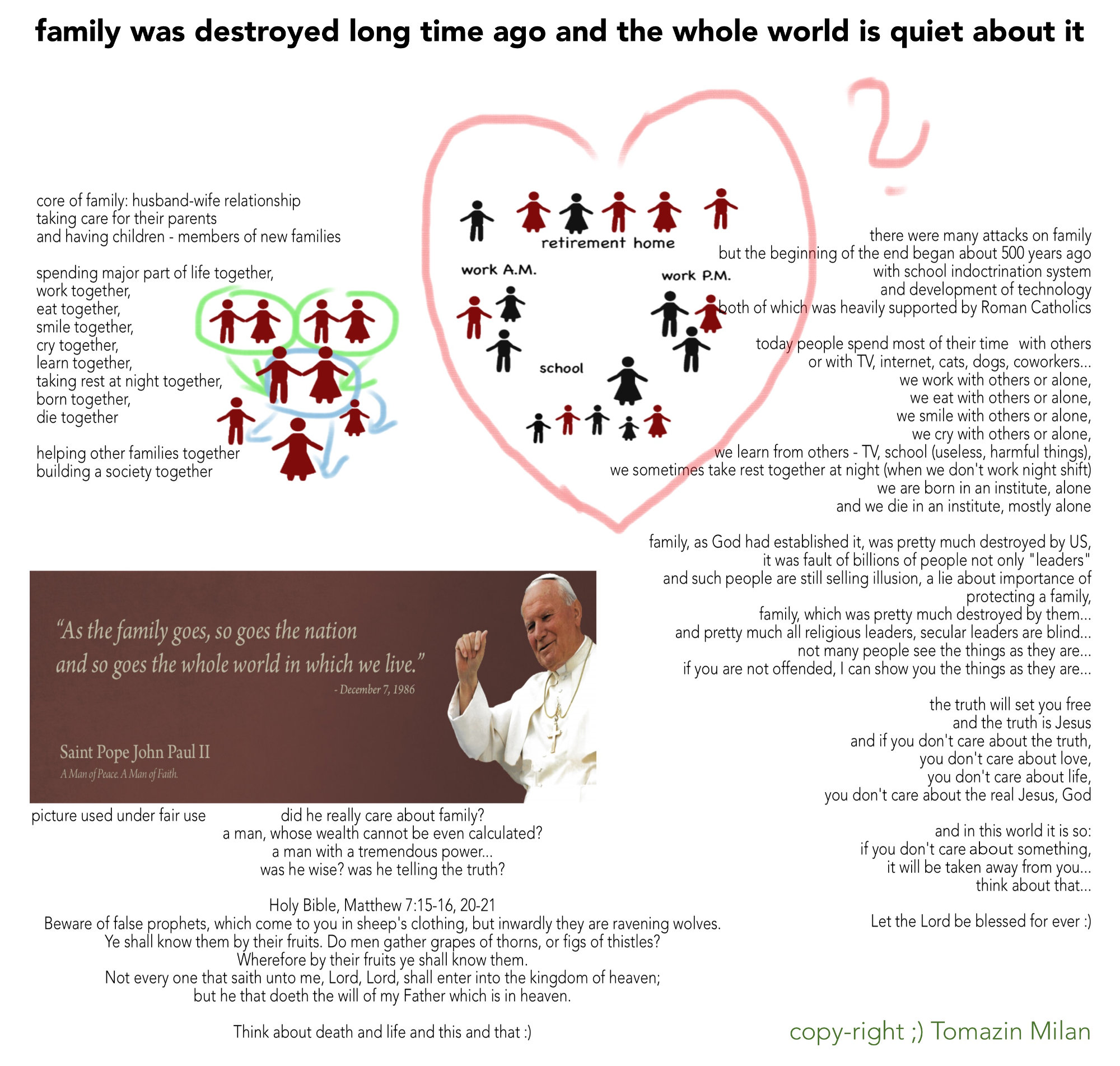 All around the world there are or were referendums about new definitions of family... Some people would like to marry even with their pets or things... but little do people know, that family was almost completely destroyed long, long time ago... it is a well known secret, pretty much everyone is aware of it but pretty much no one speaks about it... because people without love, people who don't love even those, who hurt them or want to hurt them, they all are against family... they namely cannot live in peace with anybody... it is stressful, boring... you name it...