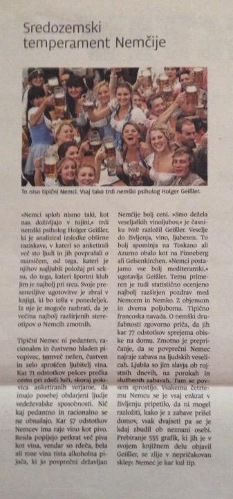 Naj samo navedem nekatere: tipični Nemec ni pedanten, racionalen (ne razmišlja!), zelo sproščen ljubitelj vina. Kar 71 % pešcev prečka cesto pri rdeči luči (kršenje zakona je kul). Ha, njegovo raziskavo je objavil celo časnik Welt.