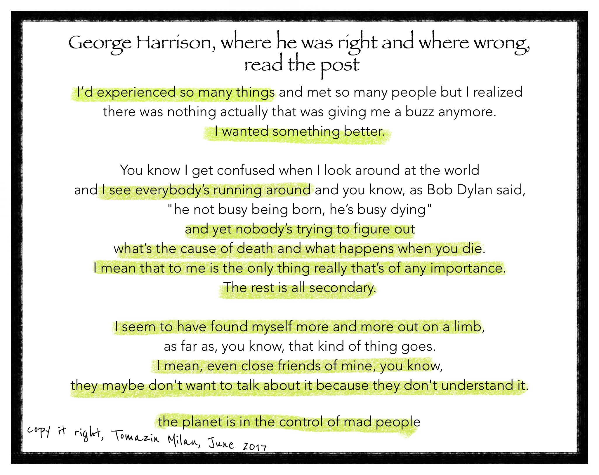 Moj komentar: Začel je z verovanjem, zaupanjem v Biblijo, v kateri ni našel praktično ničesar, kajti iskal je še naprej in drugje in končal z meditacijo. Ali je res, da je vse v nas, znotraj? Biblija govori o vesti in o besedi, informaciji, ki je zapisana v Bibliji. GH je bil sledilec Ved. In tudi sam je dejal – ne vem, če v tem intervjuju ali v kakšnem drugem – da bo njegova pesem, pesmi, da bodo odprle nekaj v drugih ljudeh, tako kot mantre… Torej, ni vse znotraj.
