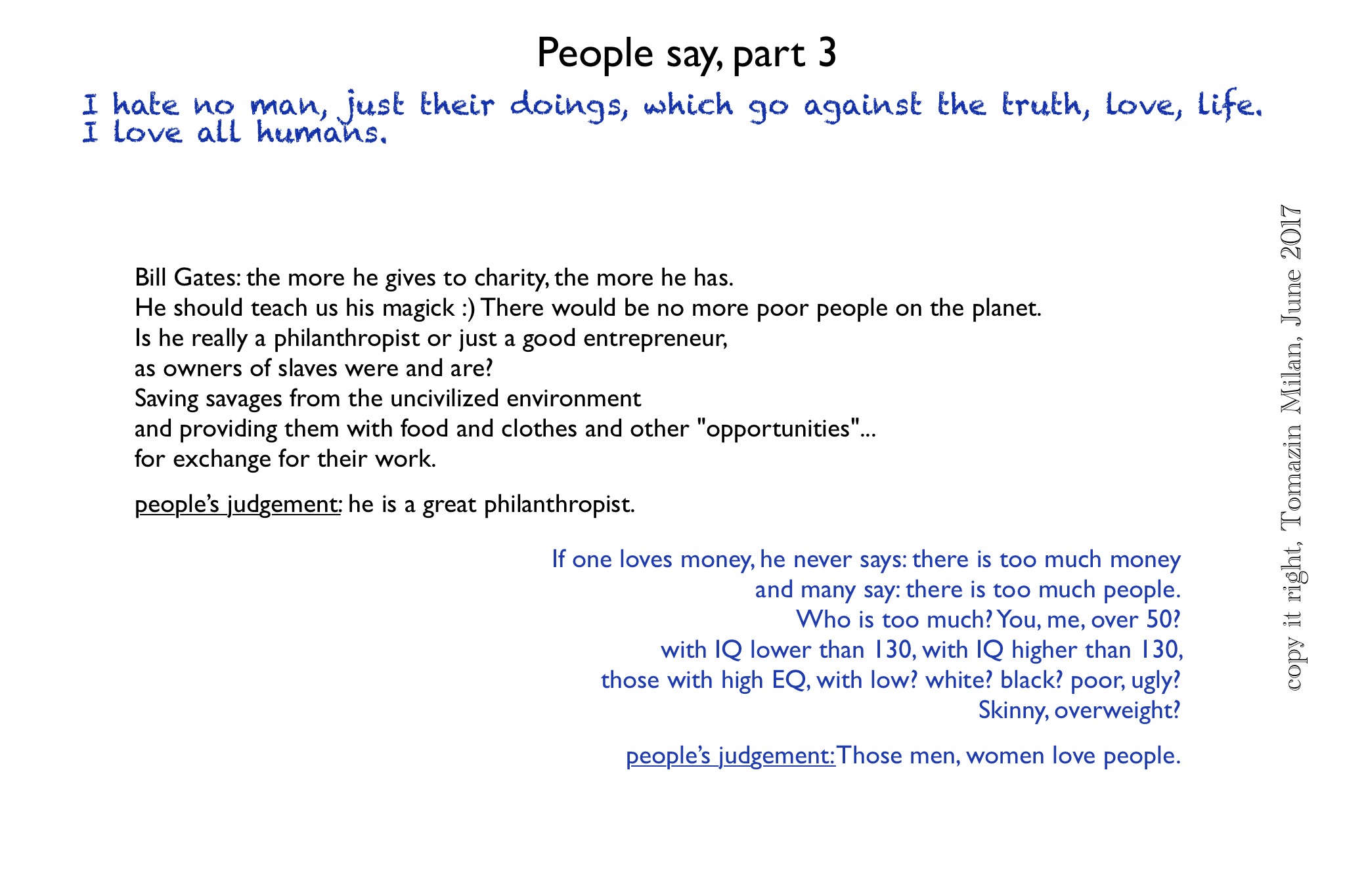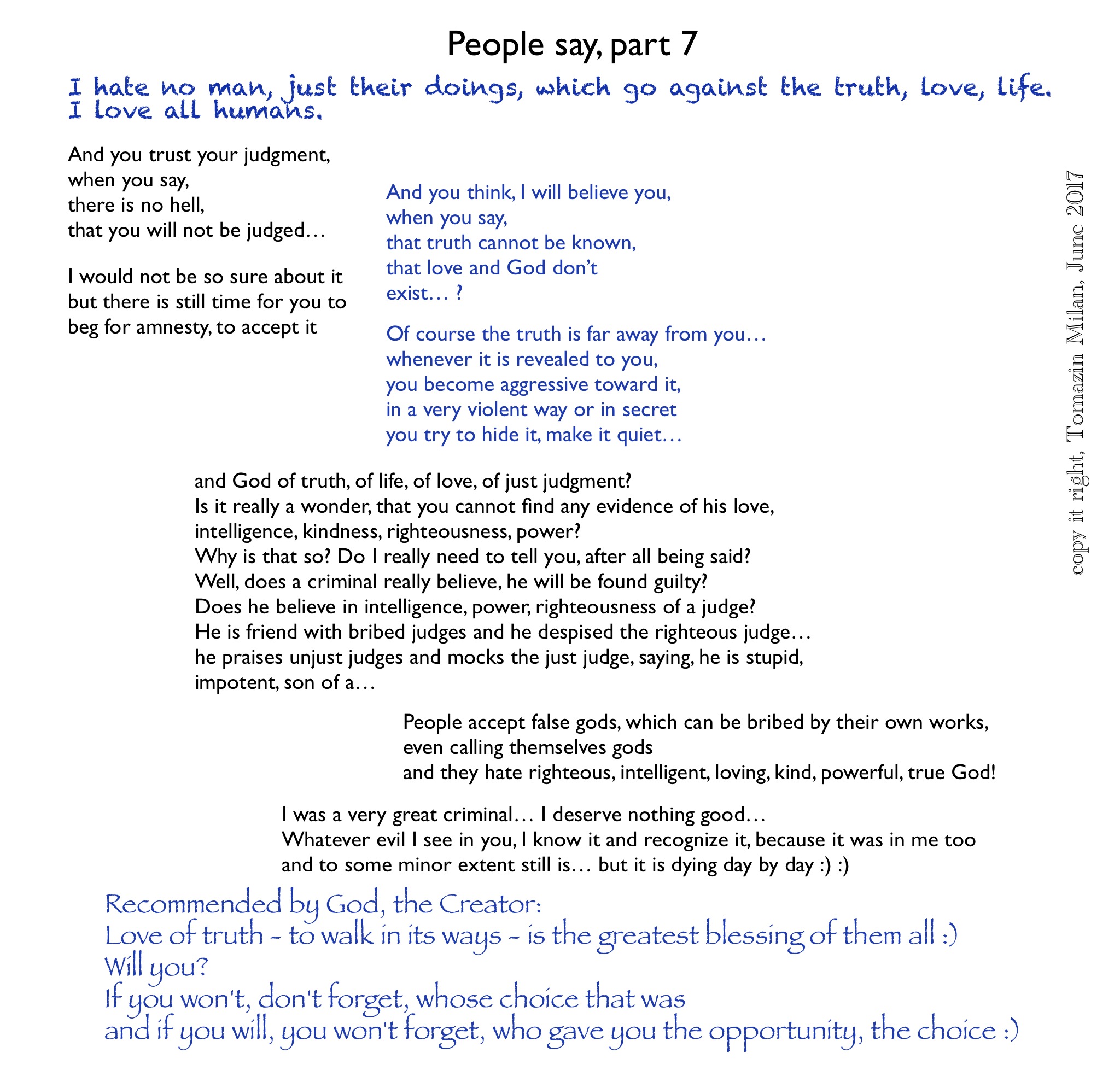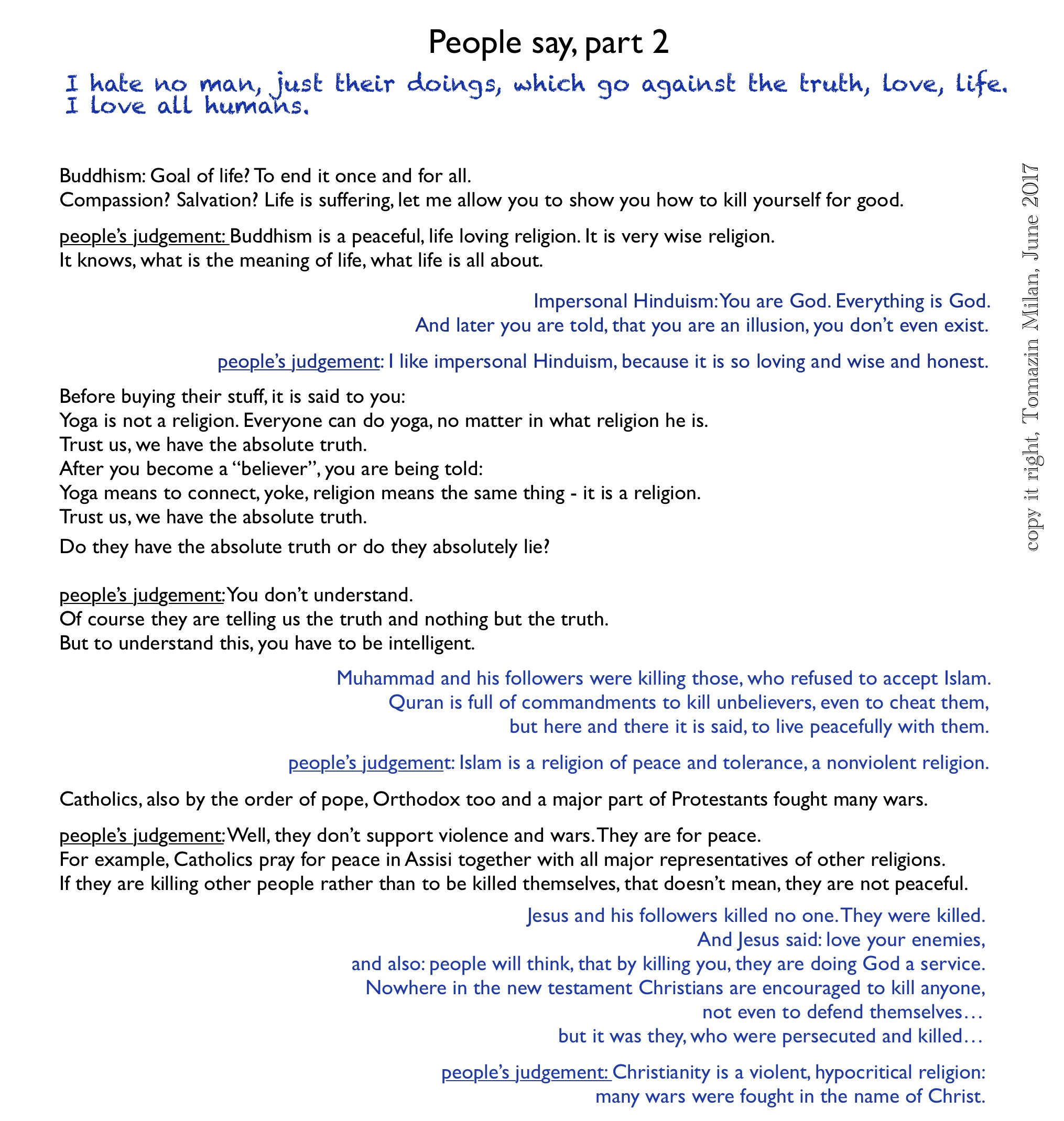 Ne sovražim nobenega človeka, samo njihova dela, ki nasprotujejo resnici, ljubezni, življenju.
