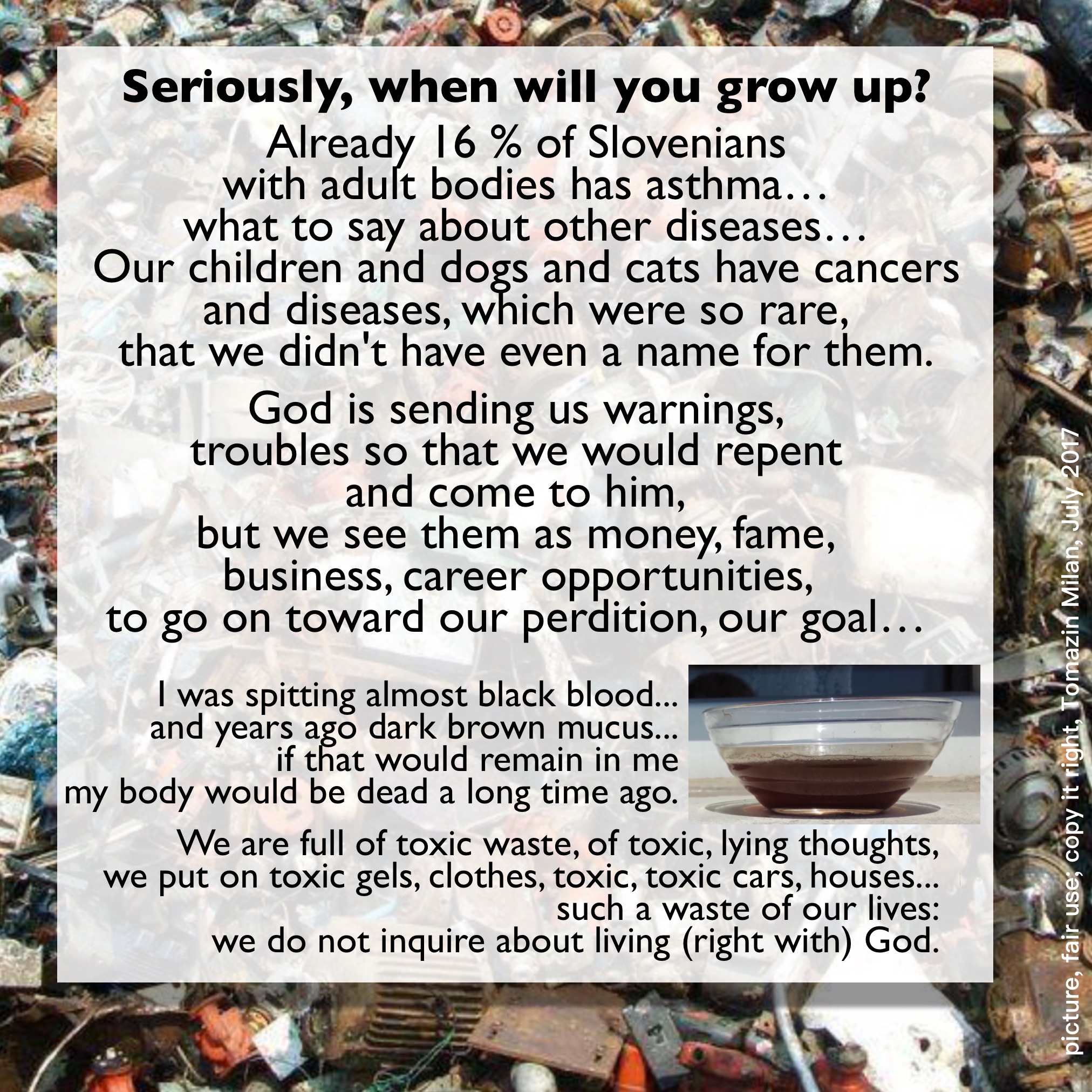 Polni smo strupenih odpadkov, smeti, strupenih, lažnivih misli, na sebe nanašamo strupene gele, obleke, strupene, strupene avtomobile, hiše... škodimo si, tratimo svoje zdravje